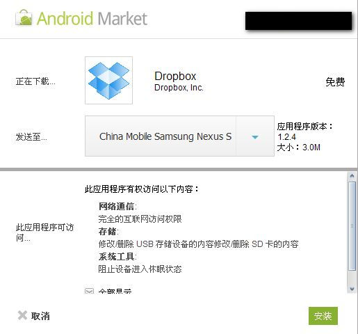 我对 Android Market 最满意的一点就是,通过网页版安装程序非常方便。看到博客上推荐的应用,打开地址,点击安装就会自动推送到手机上。